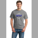 T-shirt with front chest logo. 6.1-ounce, 100% cotton (preshrunk jersey knit) Seamless double-needle 7/8" collar Double-needle sleeves and hem Taped neck and shoulders cotton/poly. Sports Grey 90/10 cotton/poly.